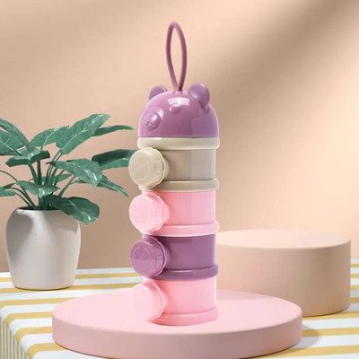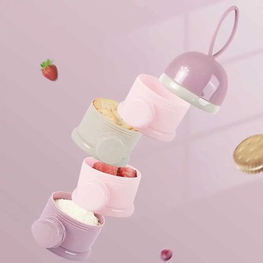 Ideal para transportar snacks o porciones de leche en polvo, este dispensador tiene 4 compartimientos separados, apilables y con tapa a prueba de derrames. Compacto, higiénico y muy práctico.